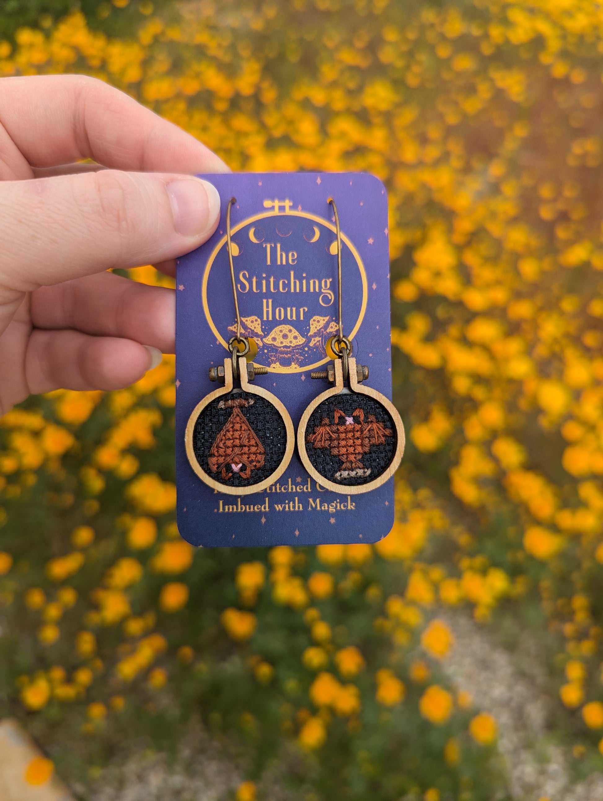Cross-stitched bat hanging from a branch (left in picture). Framed in miniature wooden hoop, on a 24 inch chain. Pendant measures .98 inches across.