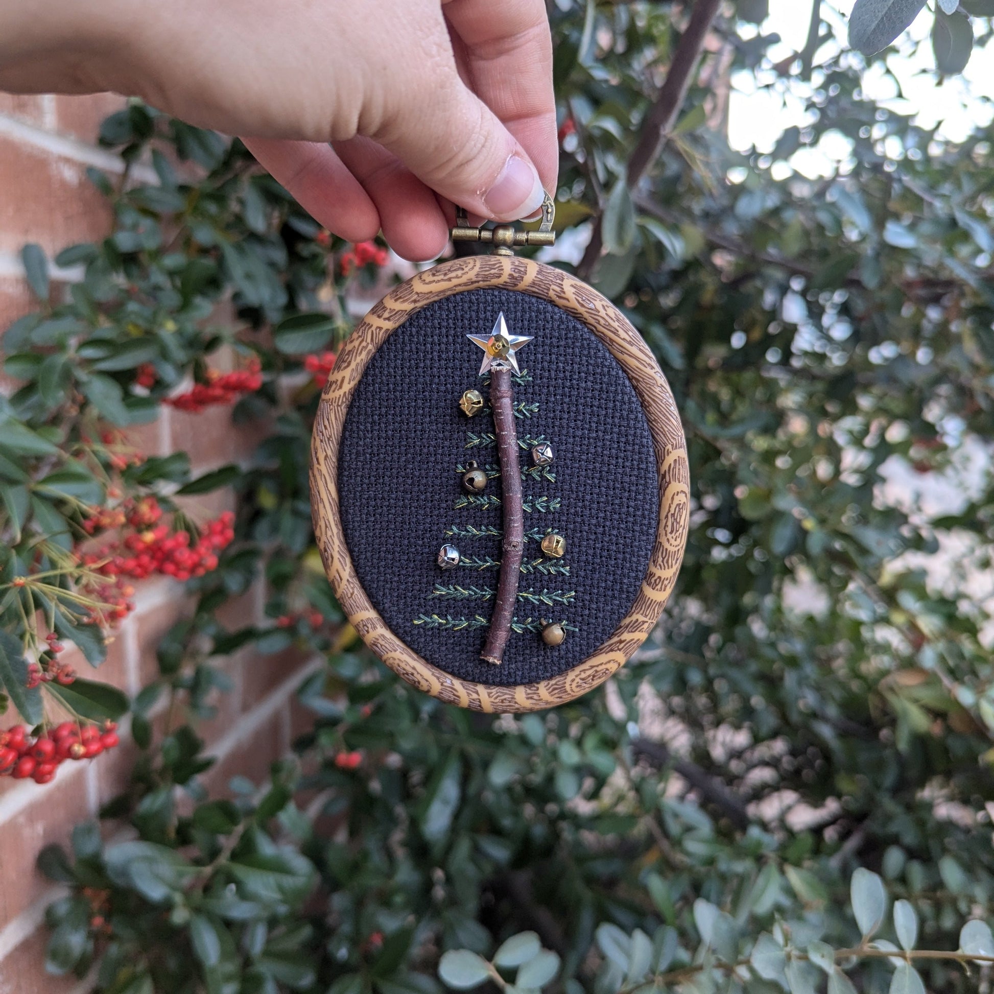 Embroidered fir tree decorated tree embellished with jingle bells, sequins, and a real birch twig. Set in 4" faux wood hoop with brass hardware.