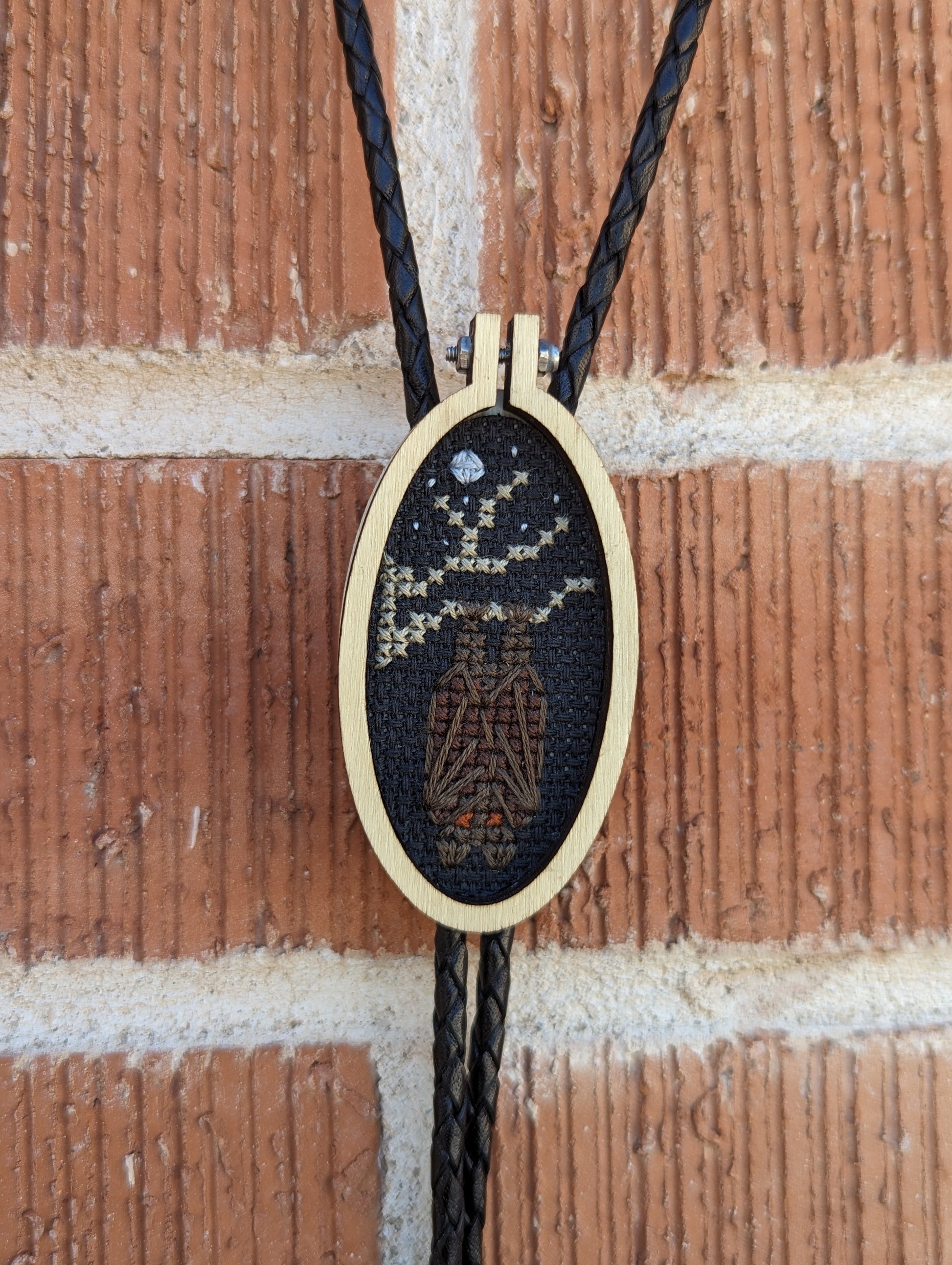 Cross-stitched bat hanging in a tree, set in miniature embroidery hoop. Vintage silver tips, genuine black leather cord. People under 6ft tall tend to prefer 34"-38", and people over 6ft tall would likely prefer 40"-44".