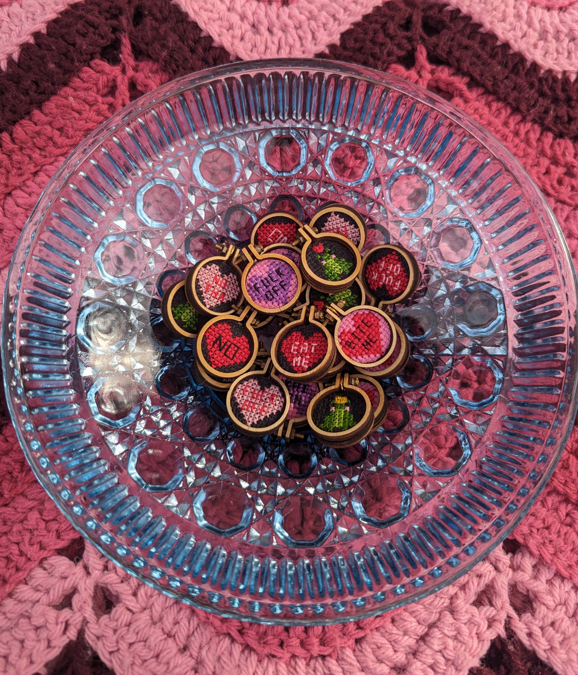 Cross-stitched conversation heart emblazoned with "Bite Me". Red heart stitched on pink aida, set in miniature wooden hoop on 24 inch chain. Pendant measures .98 inches across.