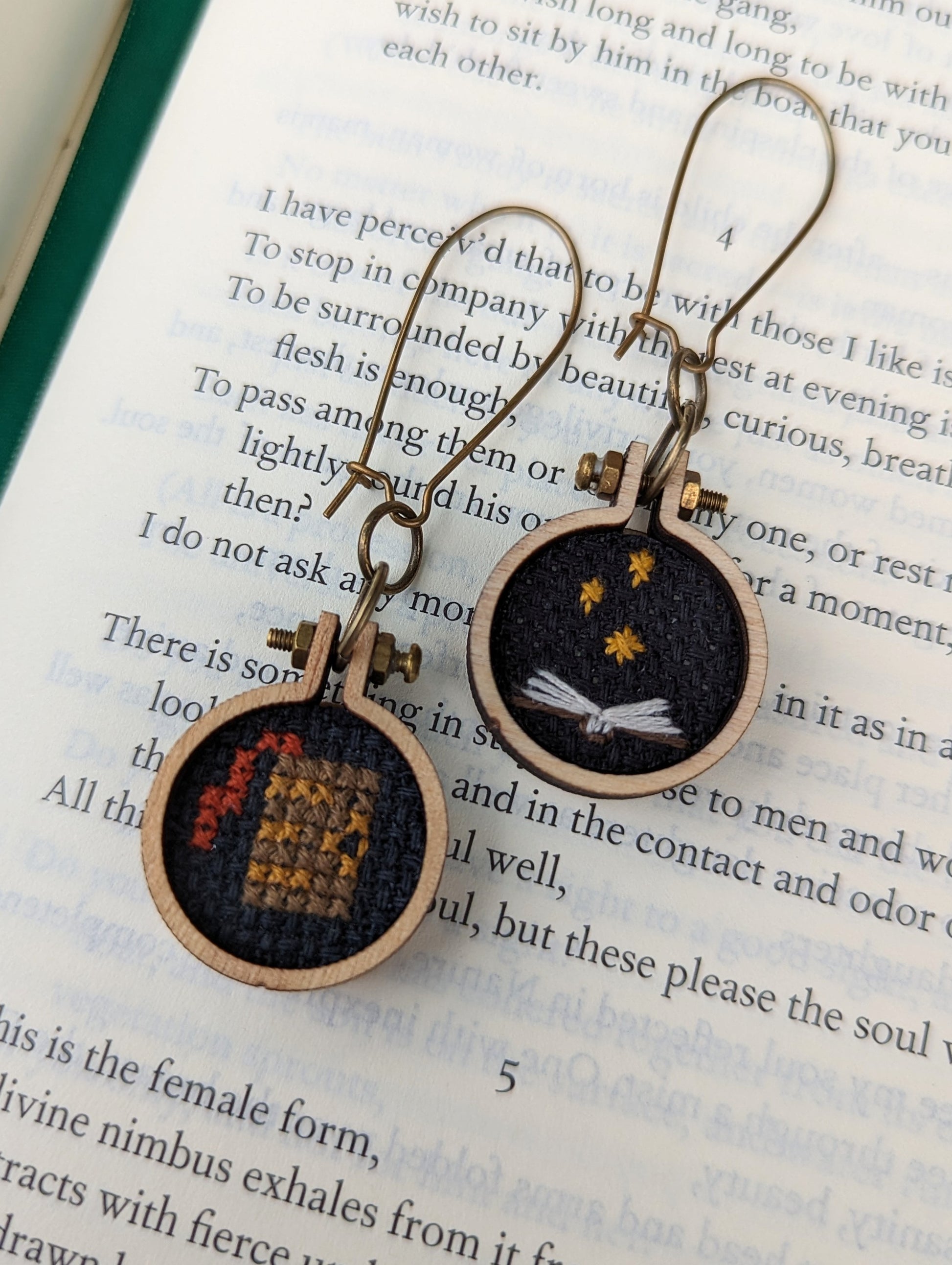Cross-stitched open book framed in miniature wooden hoop, on 24" chain. Pendant measures .98 inches across.