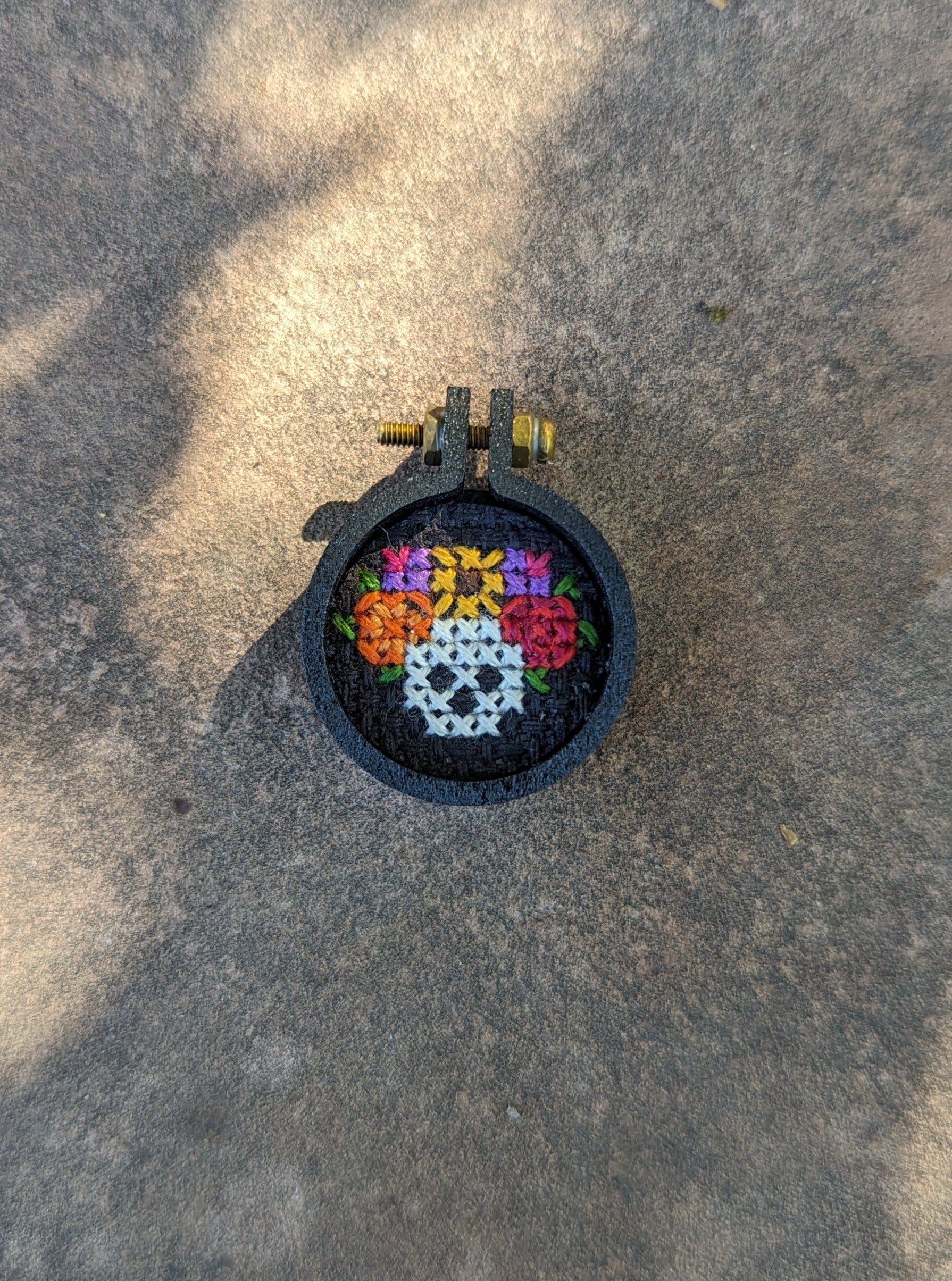 Cross-stitched skull with flower crown framed in miniature natural wooden hoop, on a 24 inch chain. Pendant measures .98 inches across.