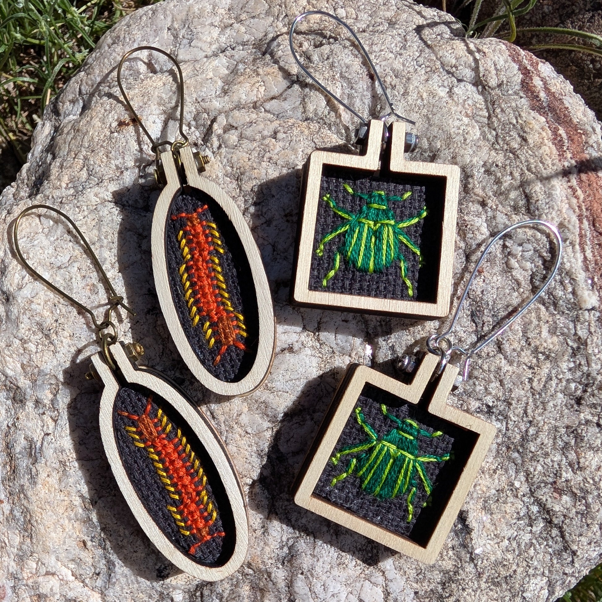 Cross-stitched Giant Arizona Centipedes framed in miniature wooden hoops, with silver kidney wires. Each earring measures .90 inches wide, 2 inches long, plus hooks.