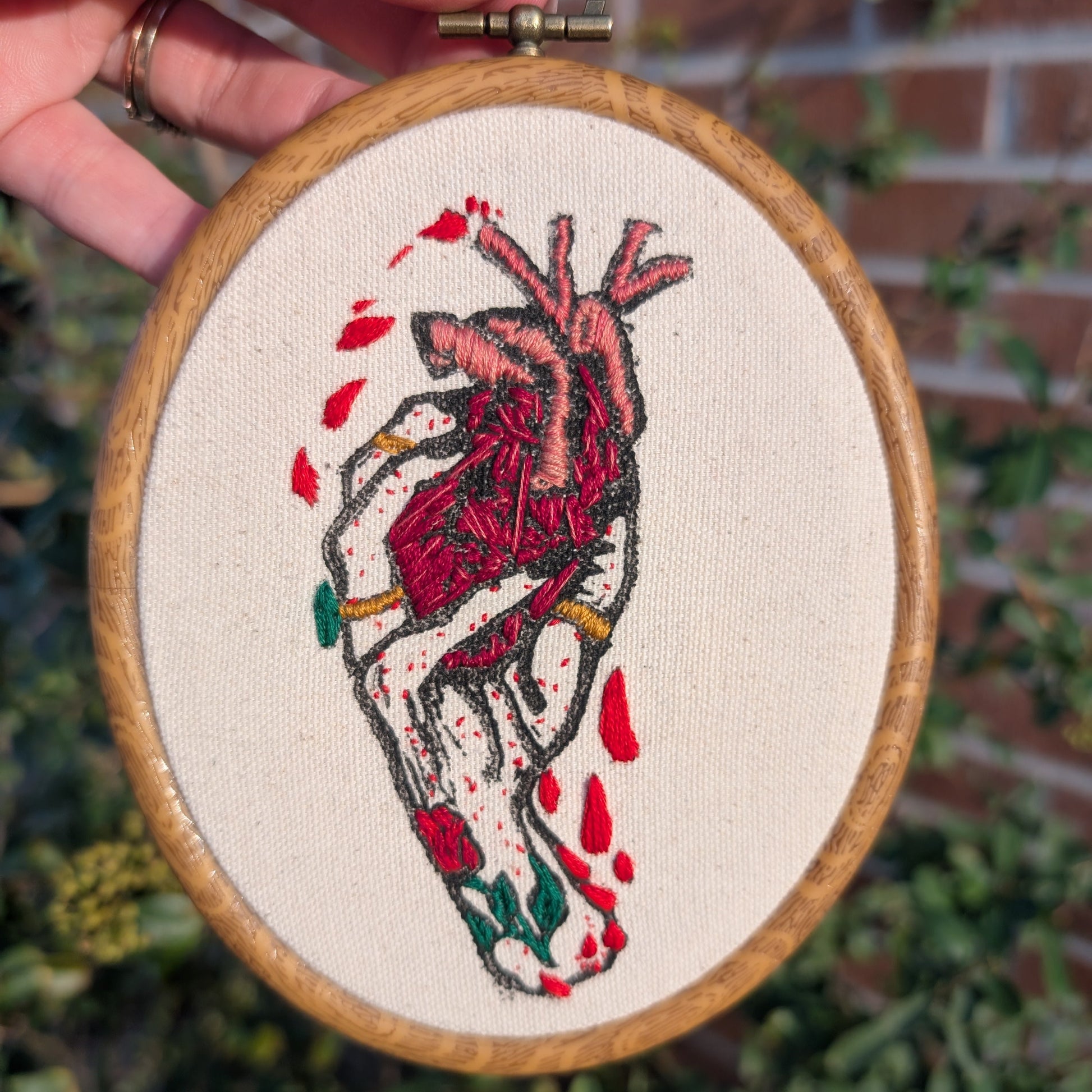 Original linocut print by Zena Carves, hand embroidered details, framed in 6" oval hoop.
