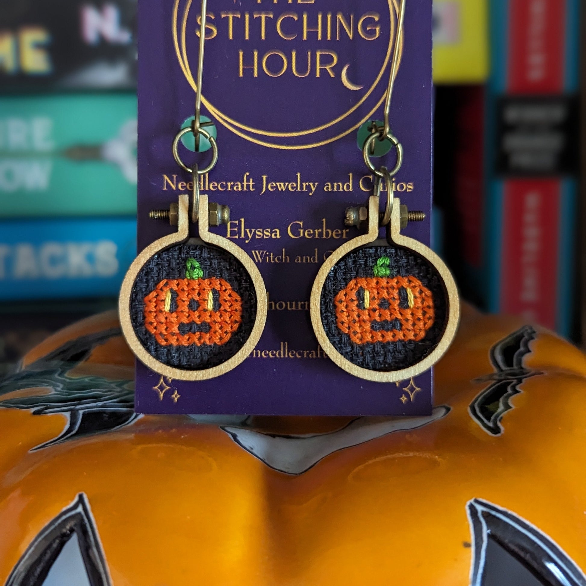 Cross-stitched jack-o'-lanterns framed in miniature wooden hoop, with kidney wires. Each earring measures .98 inches across.
