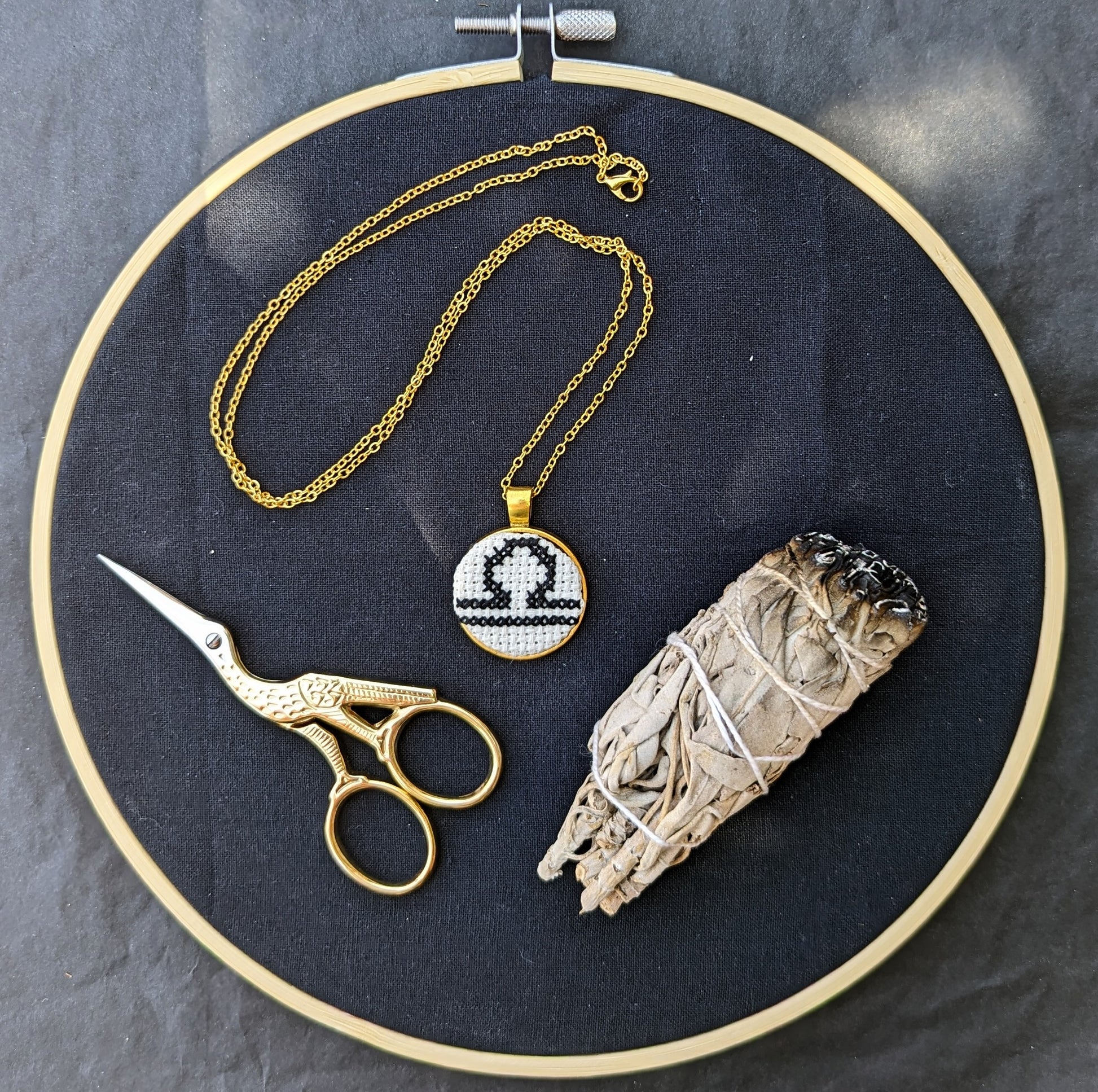 Cross-stitched Libra symbol set in metal bezel, on a 24 inch chain. Pendant measures 1.06 inches across.