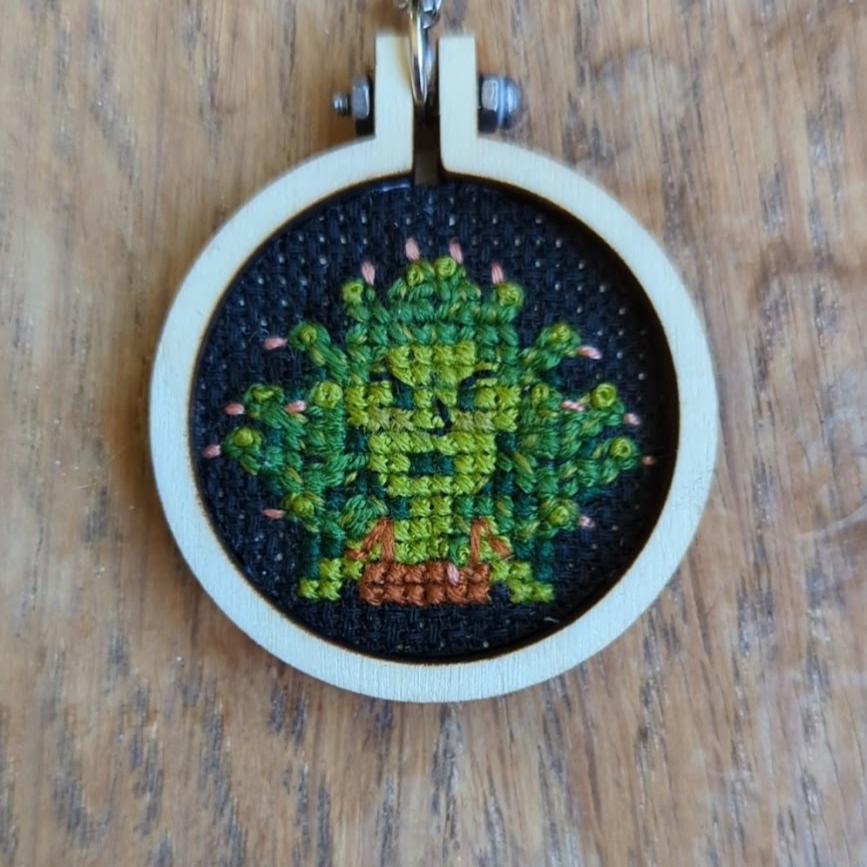 Cotton aida fabric, cotton embroidery floss, wooden hoop or metal bezel, metal findings.