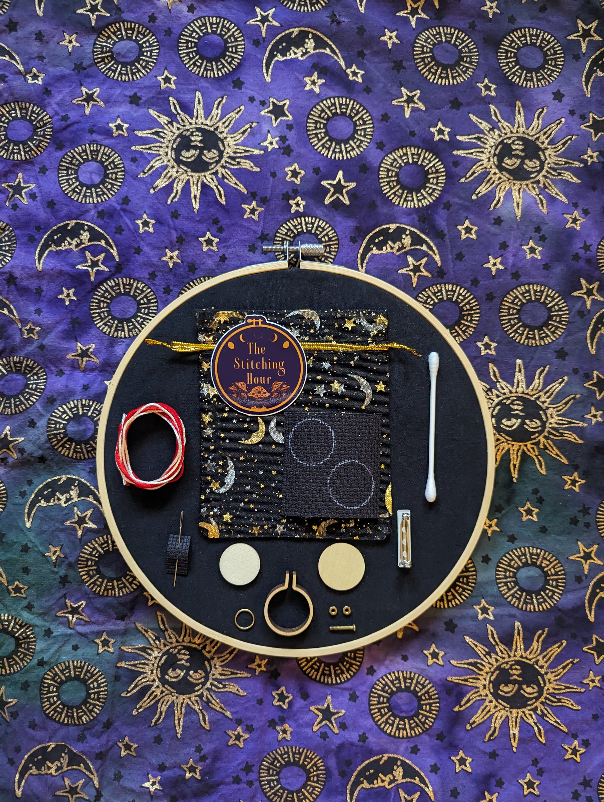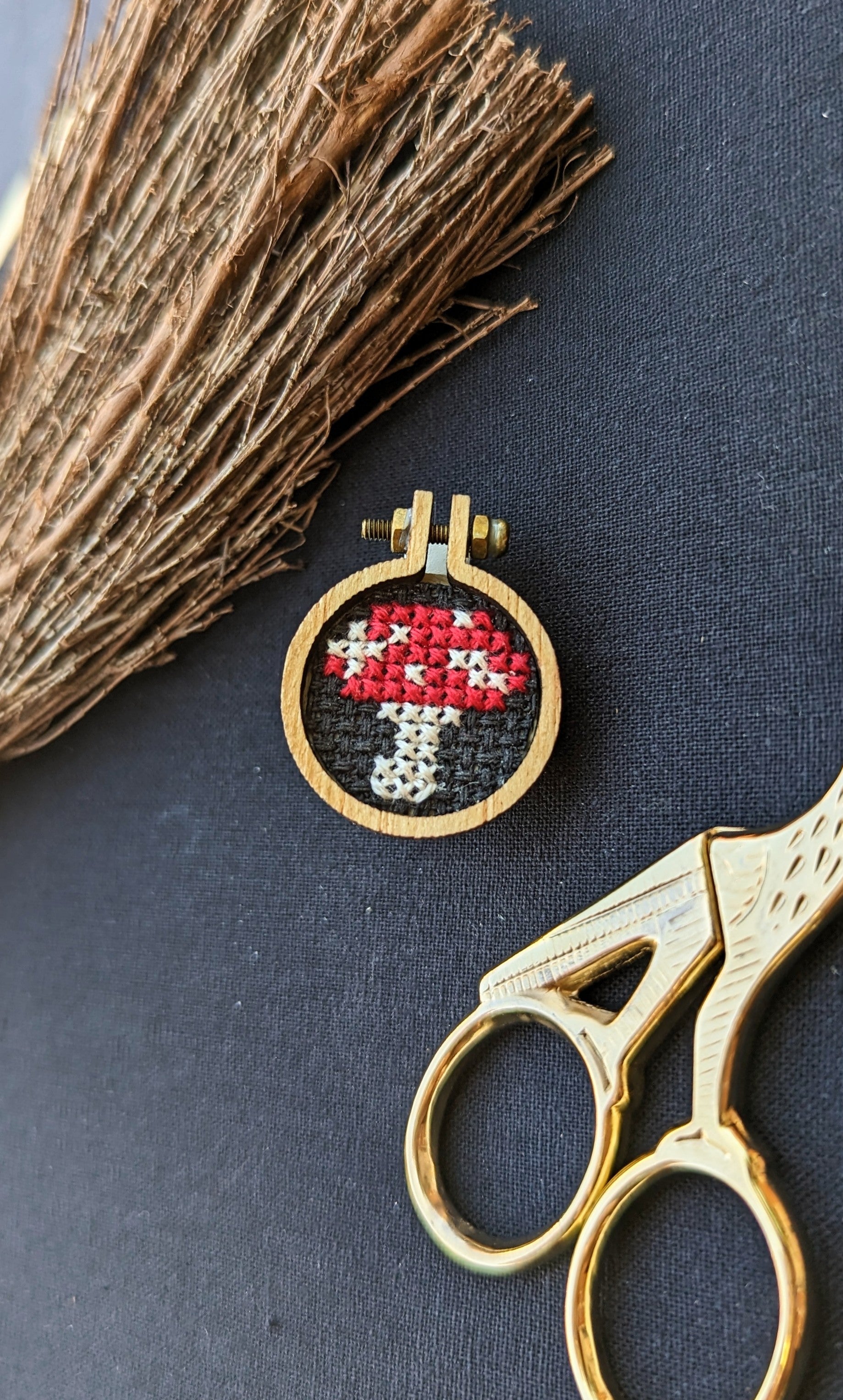 Cotton aida fabric, cotton embroidery floss, wooden hoop or metal bezel, metal findings.