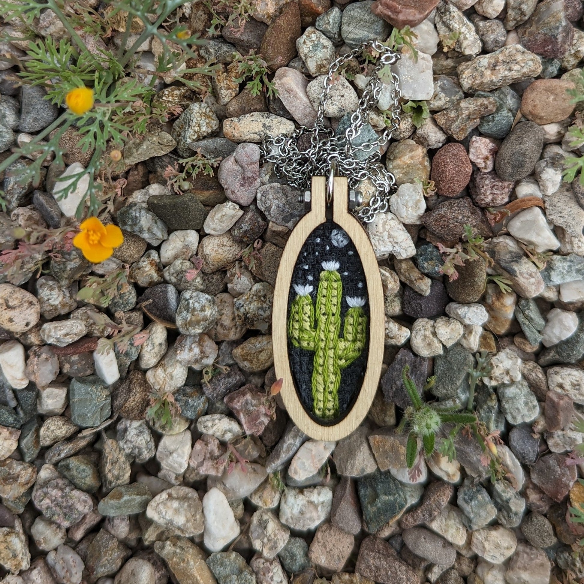 Cross-stitched saguaro earrings framed in miniature wooden hoops, with silver kidney wires. Each earring measures .90 inches wide, 2 inches long, plus hooks.