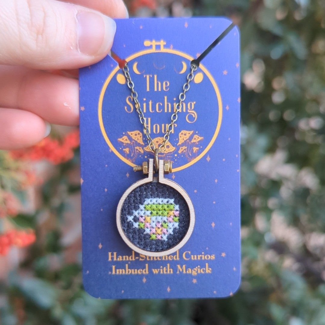 Cross-stitched cup of tea framed in miniature wooden hoop, on a 24 inch chain. Pendant measures .98 inches across.