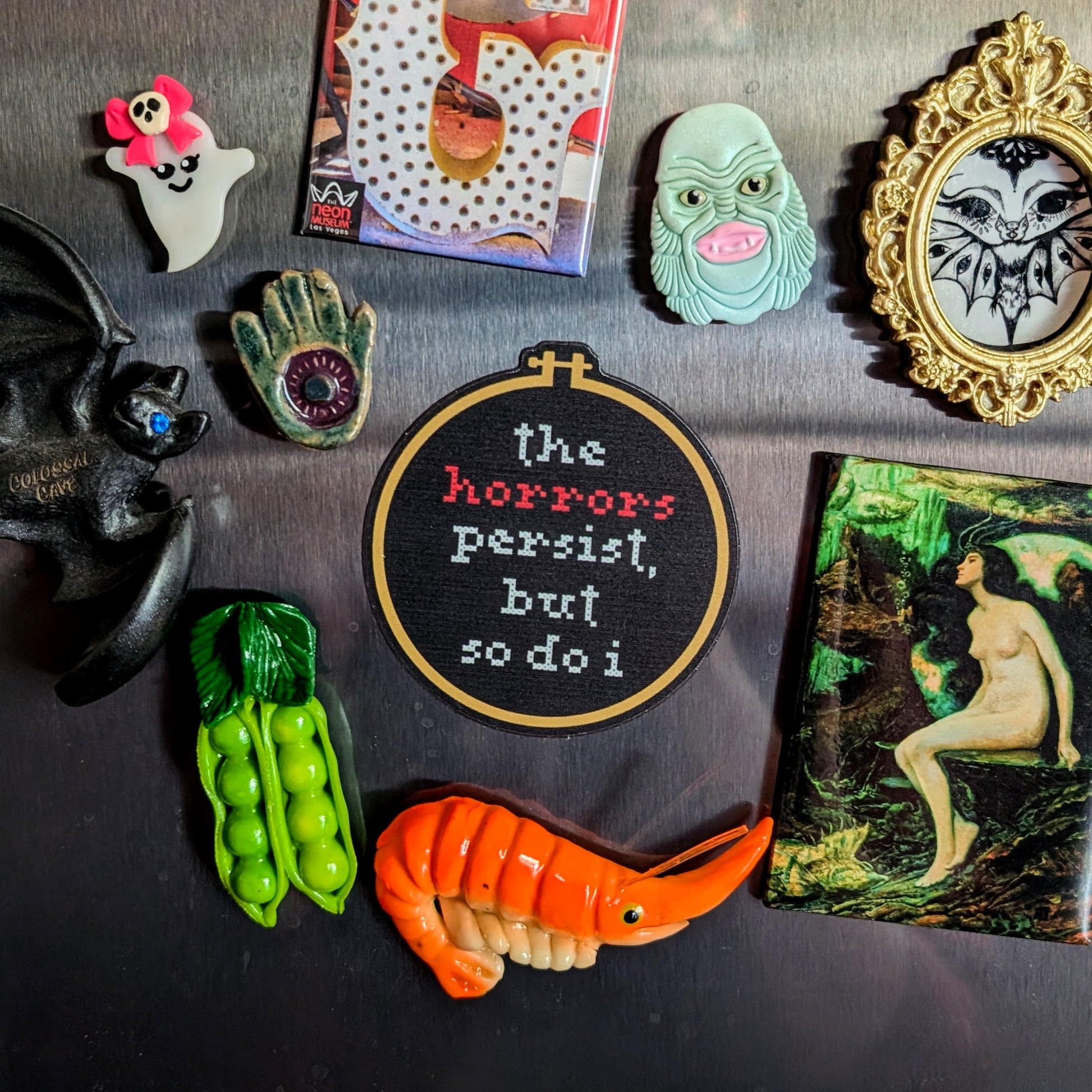 3" inch The Horrors Persist, But So Do I in hoop as a weatherproof matte vinyl magnet! For your car, fridge, locker, toolbox or anywhere else magnets are the decor of choice.