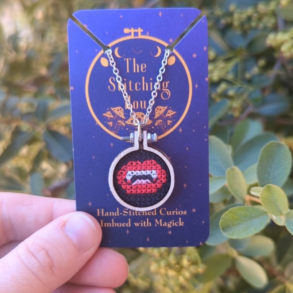 Cross-stitched vampire fangs framed in miniature wooden hoops, on 24 inch chain. Pendant measures .98 inches across.