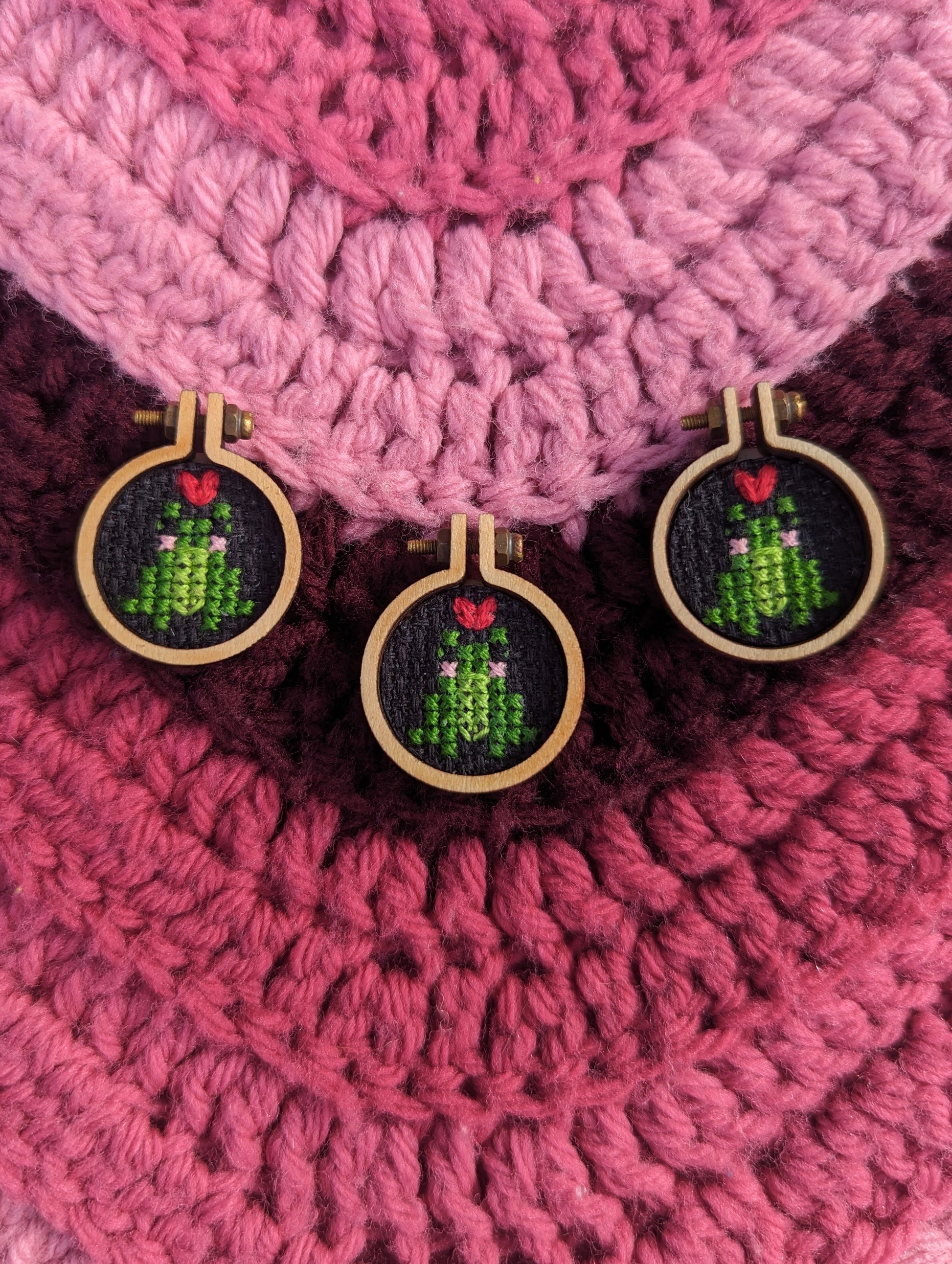 Cross stitched frog with a wizard hat or plain, set in miniature wooden hoop on 24 inch chain. Pendant measures .98 inches across.